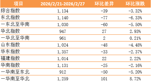 华南区域:市场整体保持节后稳步恢复态势。本期华南指数报1131点,环比下跌25点,跌幅2.16%,其中华南至东北指数报912点,环比下跌50点,跌幅5.20%,华南至华北指数报1259点,环比上涨101点,涨幅8.72%。