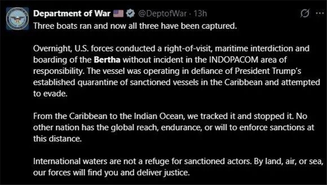 当地时间 2 月 24 日,美国国防部在社交媒体 X 平台发布声明,宣称美军在印度洋马尔代夫附近海域对悬挂库克群岛国旗的超大型油轮 Bertha 号实施了登船临检与海上拦截行动。这是特朗[详细]