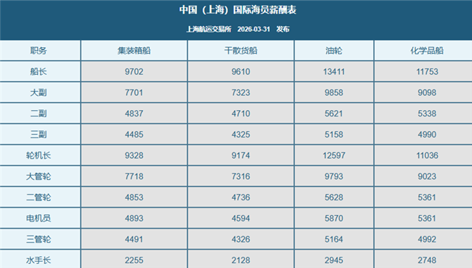 中国(上海)国际海员薪酬指数 China Crews Remuneration index 中国(上海)国际海员薪酬指数评述 (2026.3) 2026年3月31日,上海航运交易所发布的中国(上海)国际海员薪酬指数报收1398.10点,[详细]