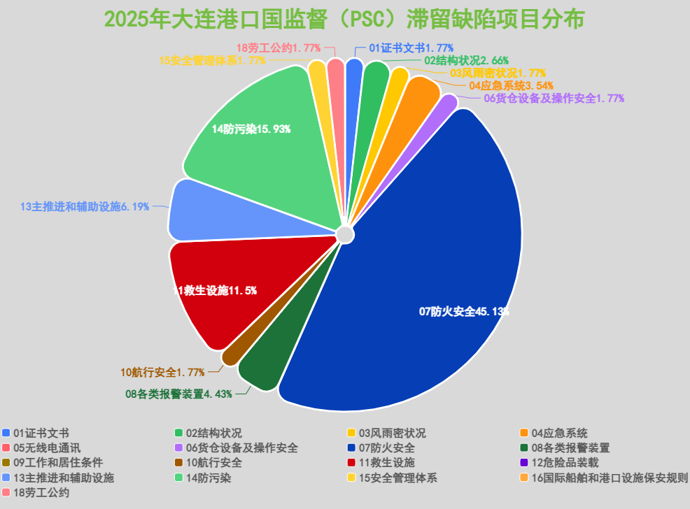 2025年大连港口国监督(PSC)初次检查共发现缺陷2179项,其中,滞留缺陷113项。滞留缺陷中,消防安全的占比最高,为45.13%,其次分别为防污染类缺陷和救生设备类缺陷,分别占比15.93%和11.50%。