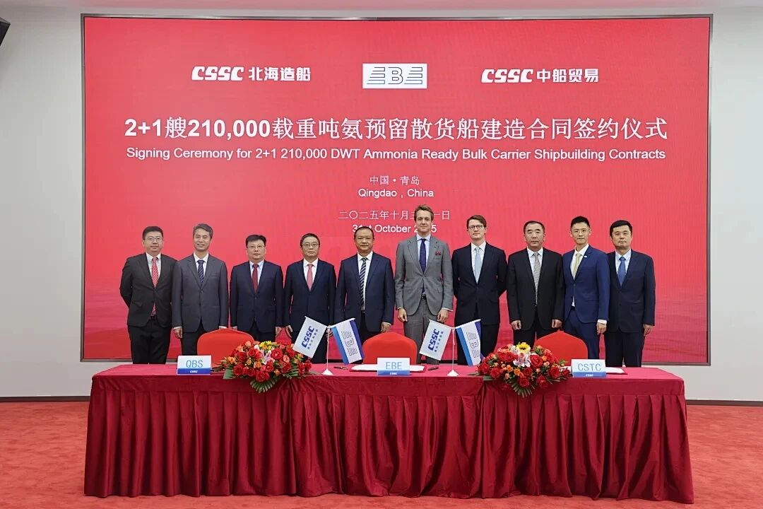 10月31日,EBE与青岛北海造船及中船贸易正式签订 2+1艘21万吨级Newcastlemax氨燃料预留型散货船建造合同。签约仪式由EBE首席执行官 Basile Aloy、北海造船总经理助理 尹海军 和中船贸易船海业务二部副总经理 黄重阳 共同签署。