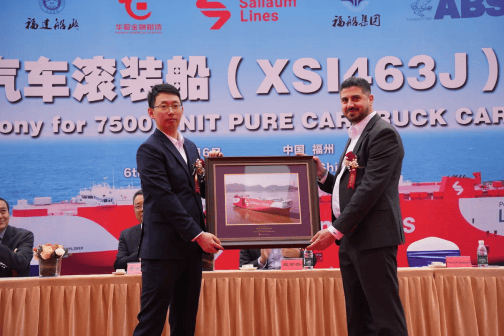 在交付仪式现场,福建船政党委委员、总经理曾金柱与Sallaum Lines总经理Hassan Salloum分别致辞,并举行了舞狮点睛、互赠礼品、颁发交船奖金以及命名与剪缆“掷瓶礼”等环节。新船被命名为“Ocean Explorer”,标志着Sallaum Lines全球PCTC运力版图再添新成员。