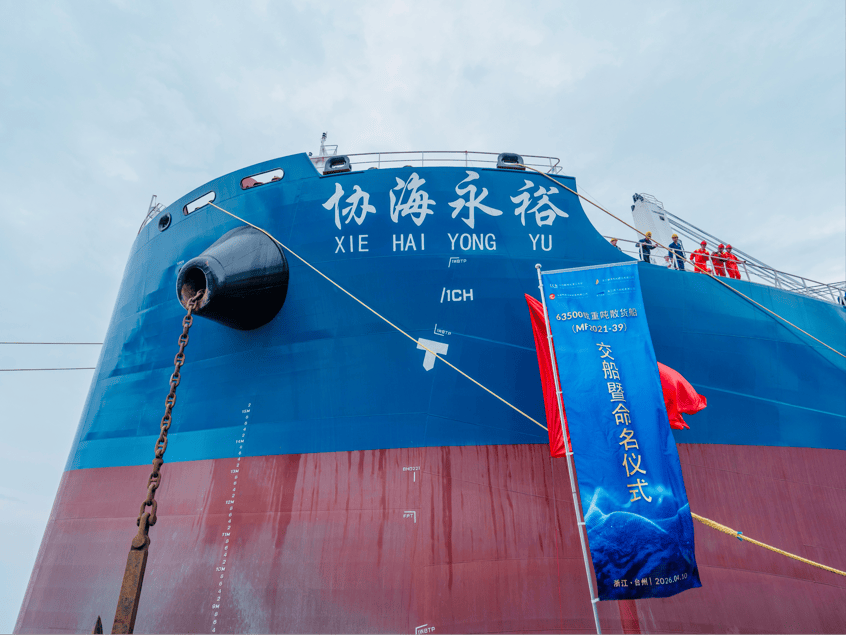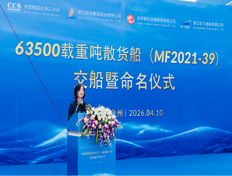 2026年4月10日,宏泰新航金融租赁有限公司首艘63500吨内外贸兼营散货船“协海永裕”轮在台州三门县码头隆重举行交付暨命名仪式。