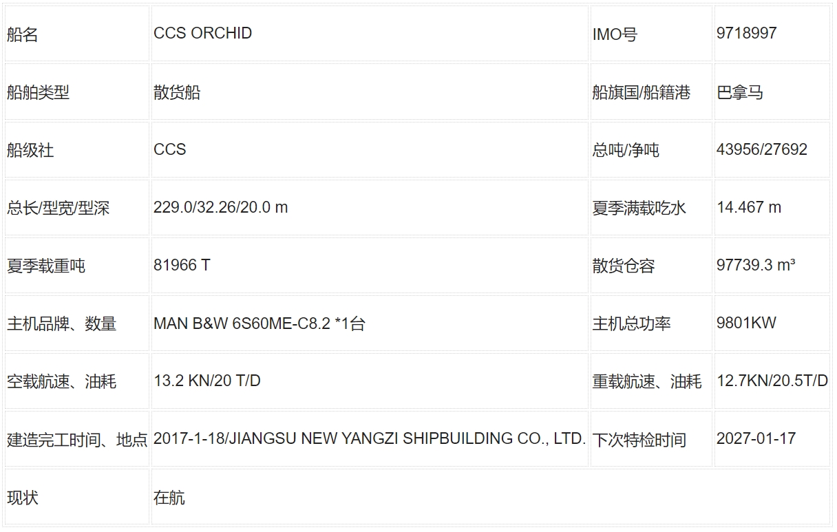 交船时间:“CCS ORCHID”轮的当前航次预计2026年3月中旬在韩国卸货后结束。最早交船时间为2026年3月20日(如中标方接受,可提前),最晚交船时间为2026年5月31日。