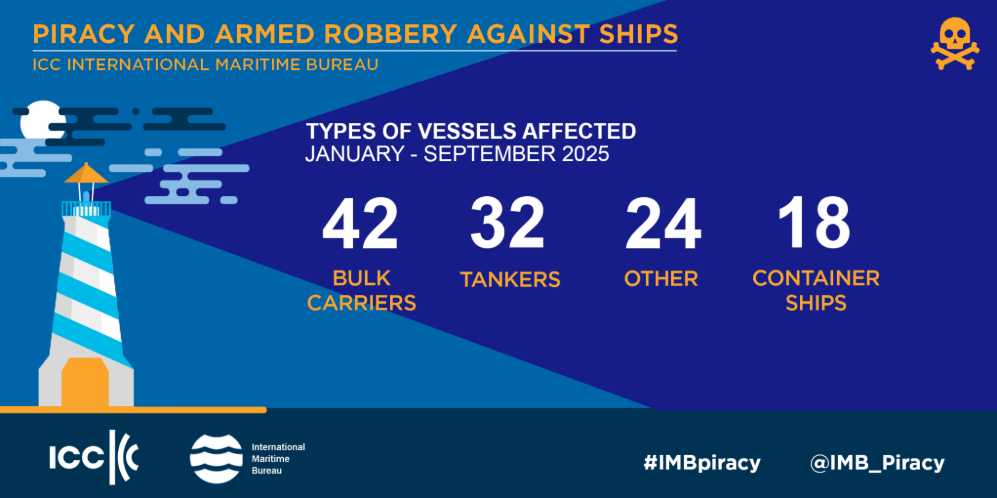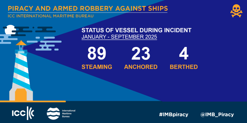 在2025年1月至9月期间,全球共报告了116起涉及海盗和武装抢劫的海上事件,较2024年同期的79起增加了37起,占比接近47%,是自2021年以来同一时间段内报告数量最多的一次。具体来看,这些事件中包括有102艘船舶被海盗和武装分子成功登船,9艘船舶遭遇登船企图,4艘船舶被劫持,另有1艘船舶遭到武器攻击。其中包括42艘散货船、32艘液货船、18艘集装箱船及其他类型船舶24艘。值得注意的是,在所有报告的事件中,被海盗和武装分子成功侵入船舶的情况高达91%。大多数非法登船行为发生在夜间,利用能见度低和船员警戒松懈的时机伺机实施行动。即便是船舶在航期间,也难逃被海盗袭击,报告表明多达89起事件是发生在船舶在航期间,有23起期间发生在船舶锚泊期间,另有4起事件发生在船舶靠泊期间。这也表明海盗等不法分子们的组织性增强,作案手法日趋熟练。