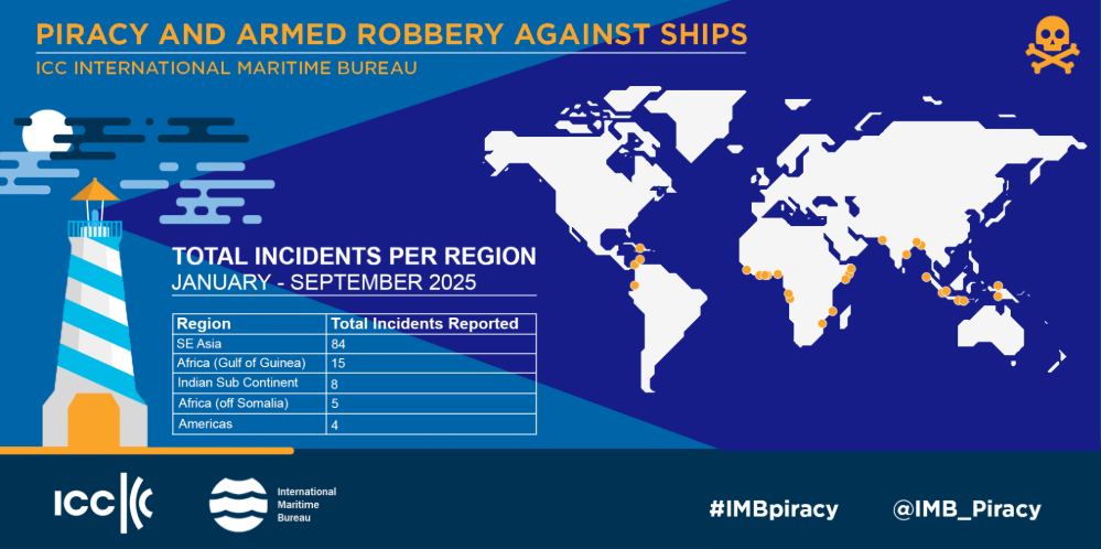国际海事局(IMB)最新发布的报告显示,2025年前九个月全球范围内报告的海上海盗与武装抢劫事件出现小幅上升趋势,其中新加坡海峡的案件数量达到自1991年有系统记录以来的最高水平。尽管整体数据有所反弹,IMB及其下属的海盗报告中心强调,从长期来看,全球海盗活动仍处于持续下降趋势,且未发生造成重大人员伤亡或船舶严重损毁的袭击事件,这充分表明当前全球海事安全威胁虽局部有所加剧,但总体仍处于可控状态。同时,IMB负责人也强调,这是一个加强警惕意识的重要时刻,绝不能因短暂的平静而放松防范,全球范围内的船舶所有人、经营人和船长必须始终坚持遵循行业指南,确保航行计划充分评估风险,并在第一时间报告任何异常情况。