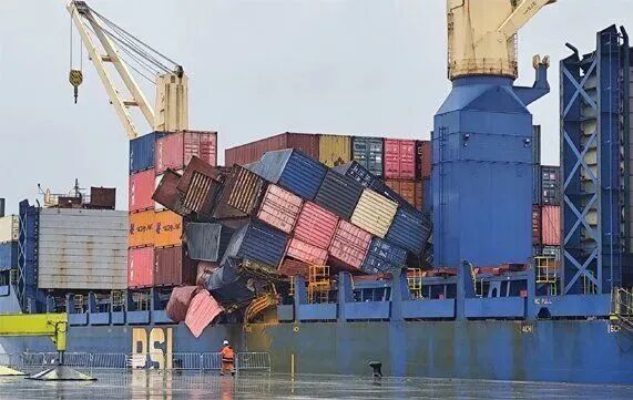 受此次事故影响,“Maria Francisca”号上装载大理石、可可、棕榈油等货物的集装箱出现移位,部分集装箱坠入海中,船体中部两排集装箱堆垛整体倒塌,多个受损集装箱悬挂在船舷外侧。