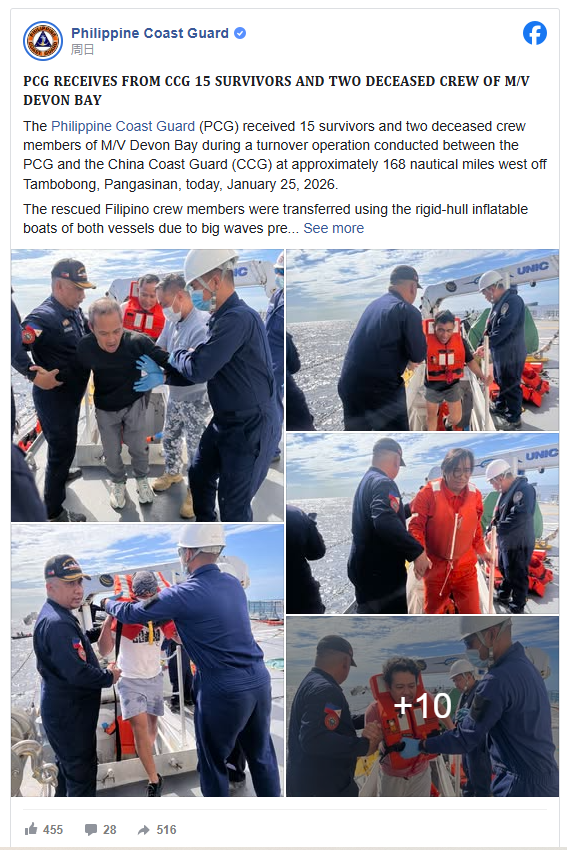 其次,救援链条虽然已实现17人寻获并返菲,但“仍有4人失联”决定了事件的最终性质。 从1月23日救起17人到1月26日完成转运与移交,说明救助、医疗照护与跨国协调总体有效;但只要仍存在失联人员,搜救就仍处于关键窗口期,其结果将直接影响家属安置、法律责任与保险理赔等后续议程的走向。