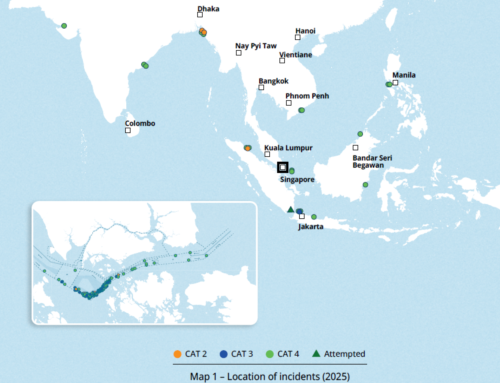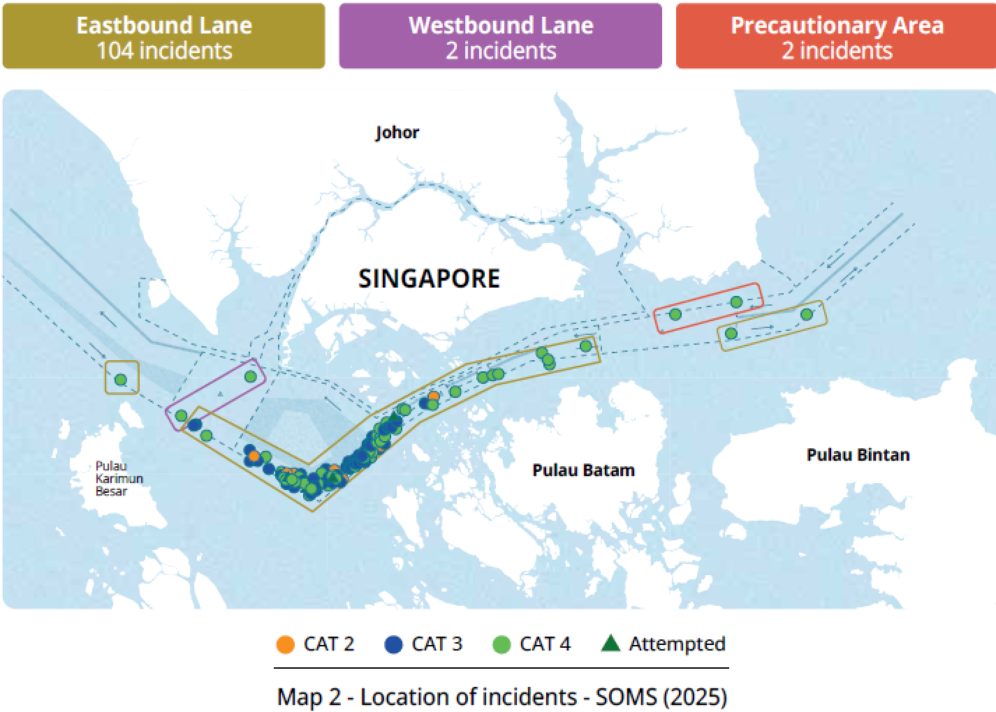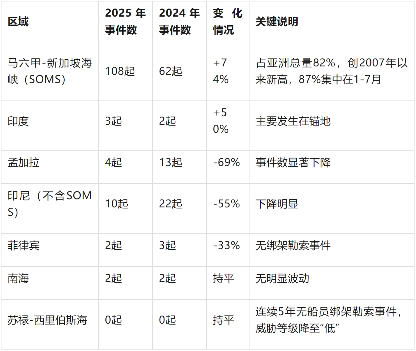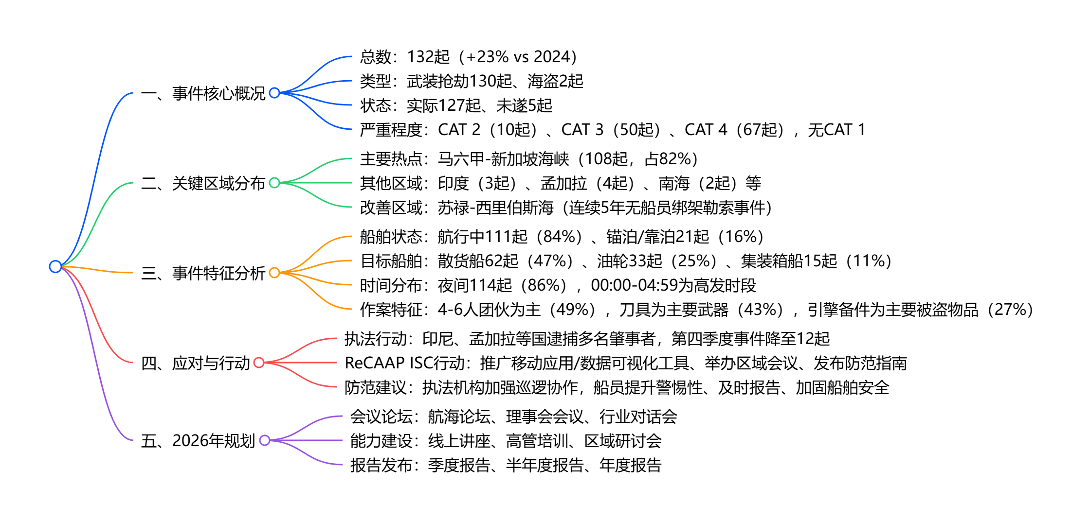 2025年亚洲共报告132起海盗及武装抢劫船舶事件,较2024年增长23%,其中130起为武装抢劫、2起为海盗事件,82%(108起)集中在马六甲-新加坡海峡(SOMS) 且创2007年以来新高;事件严重程度以CAT 3和CAT 4为主(占92%),86%发生在夜间,散货船为主要目标(47%);印尼当局7-8月逮捕肇事者后,第四季度事件数显著下降,ReCAAP ISC通过数字工具、合作会议等推动区域协作,同时向执法机构和船员提出针对性防范建议。