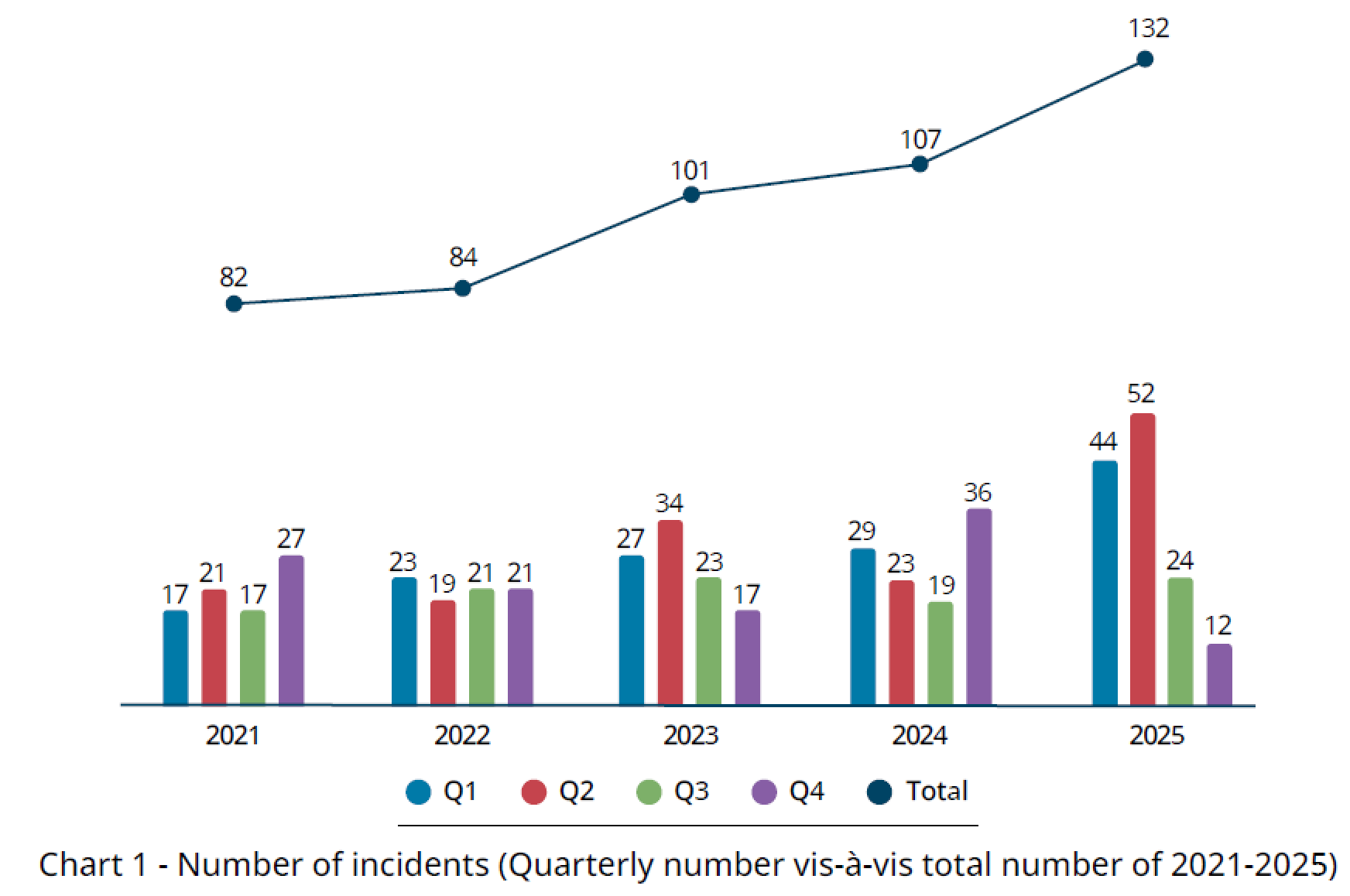 ● 总量与增长:2025年亚洲共报告132起海盗及武装抢劫船舶事件,较2024年的107起增长23%,其中实际发生127起、未遂5起。