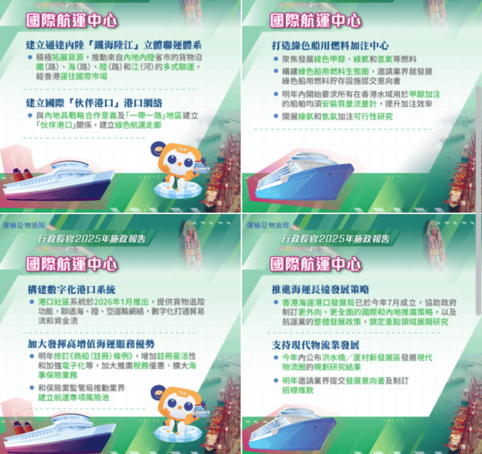 他表示,这些举措将全面提升香港航运业的竞争力与国际影响力。