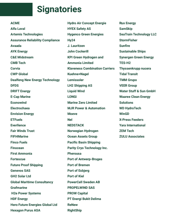 其中,航运公司包括:CMB Tech、DFDS、J. Lauritzen、Klaveness Combination Carriers、Pacific Basin Shipping、SamSkip、X-Press Feeders 等;船舶设备与技术公司包括:Alfa Laval、WinGD、Everllence、Econowind、AYK Energy、PowerCell Sweden AB 等;能源与绿色燃料相关企业包括:Yara International、Moeve、First Ammonia、ETFuels、Norwegian Hydrogen、HDF Energy、Hygenco Green Energies、CWP Global、Fortescue 等;物流企业则包括:Kuehne+Nagel;此外,还有Port of Antwerp-Bruges、Port of Bremen、Port of Esbjerg、Port of Kiel 等港口方参与签署。