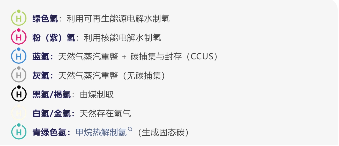 氢气可以以压缩气体(CH₂)或液态氢(LH₂)的形式供应。据生产路径不同,氢能源主要分为: