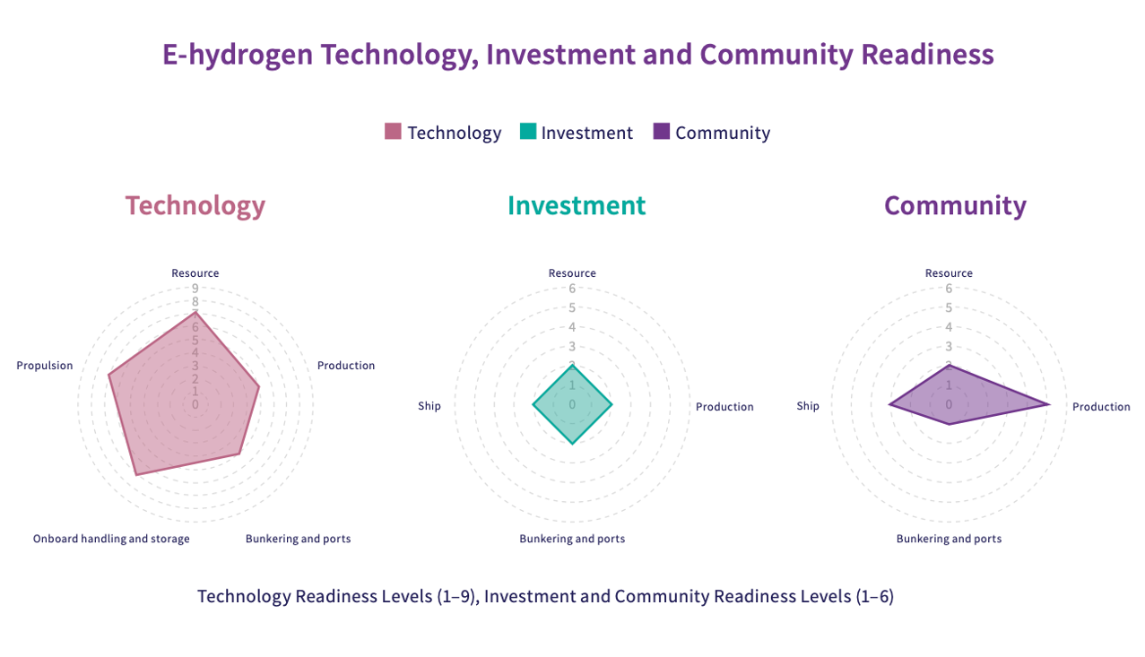 针对氢能源的可行性准备水平,海事脱碳中心(Maritime Decarbonisation Hub)以技术、投资、社区三个维度进行全面分析,分别对应: