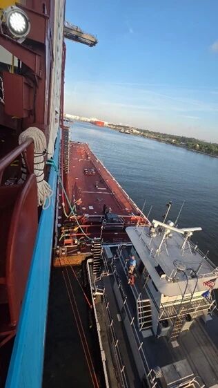 从现场情况看,此次作业采取船对船方式进行。美国海岸警卫队公布的图片显示,加注船KIRBY 29067 靠泊在 TANGIER MAERSK 舷侧实施加注,船上人员则在控制室内监测流量等操作参数。