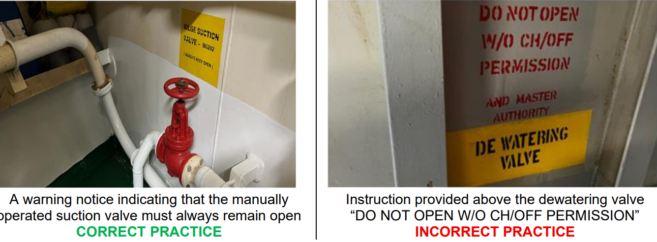 • 2nd Case: A label above the dewatering valve stated: “DO NOT OPEN WITHOUT CHIEF OFFICER’SPERMISSION”.