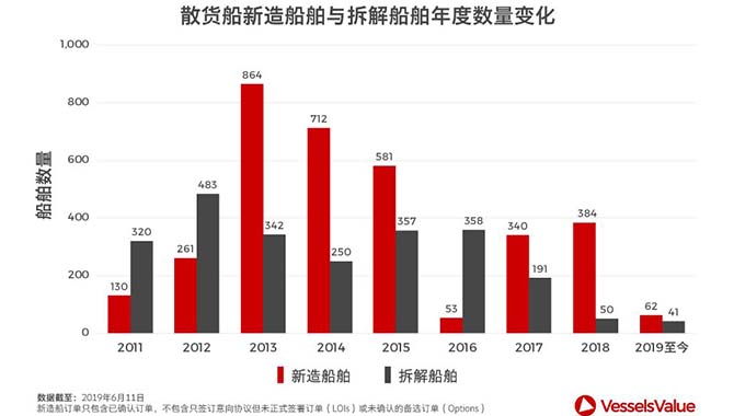 相较于疲软的二手船买卖市场,拆船市场则是另一番景象,自2019年1月以来,已有20艘好望角型散货船确认拆解,其中大部分被运往孟加拉国。相比之下,2018年全年共有17艘好望角型散货船被出售给拆船商,也使其成为最主要的报废船型。