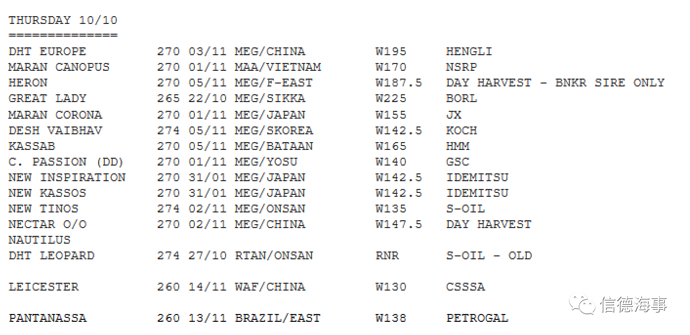 如上图表相关数据,中化集团旗下Day Harvest租下了Euronav旗下一艘名为Heron,2007年建造,297400dwt,中东-远东航线,预计装载日期为11月5日,拿到了WS187.5。要知道本周早些时候,联合石化同样航线的另一笔类似订约只拿到了WS140的水平。