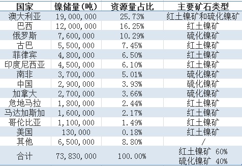 全球镍资源储量约7400 万吨,主要有氧化镍矿(又称为“红土镍矿”)和硫化镍矿两种,其中约 60%是红土镍矿, 约 40%是硫化镍矿。