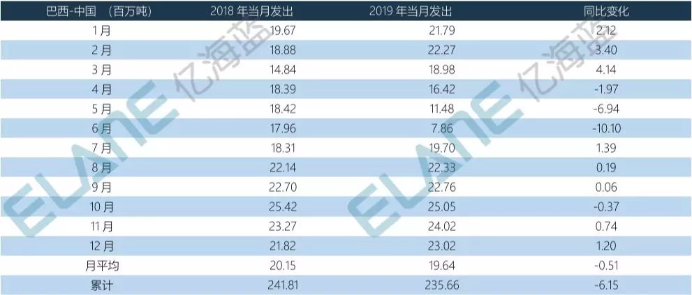 2019年巴西到中国到港量为2.36亿吨,同比减少615万吨。从月度曲线可见,受年初矿难影响,消耗库存仍难以弥补货量缺口,同时受平均抵港时间延长的影响,到港量在今年6月达到谷底,为786万吨,同比下降1010万吨。