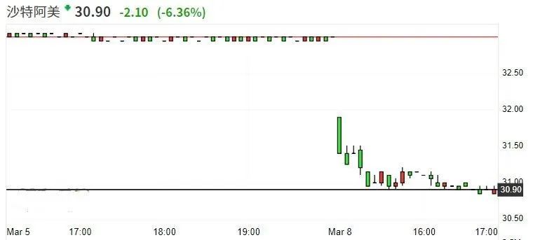 沙特阿美股价也一路走低,跌幅超过7.4%,且最低触及29.9里亚尔。