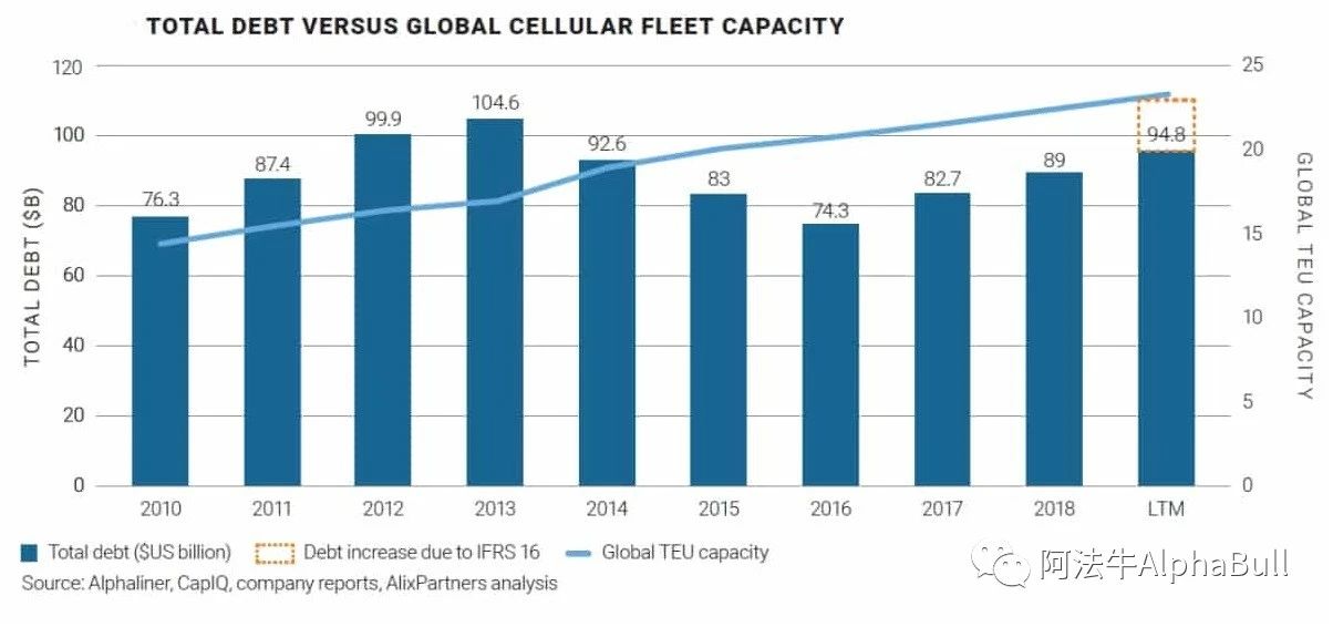 在2013年债务总额曾达到1046亿美元的峰值。博拉瑟说债务的增加抬高了船队的资本投入。在大家攀比越造越大的船舶的那段时间里,新造船订单量增加。