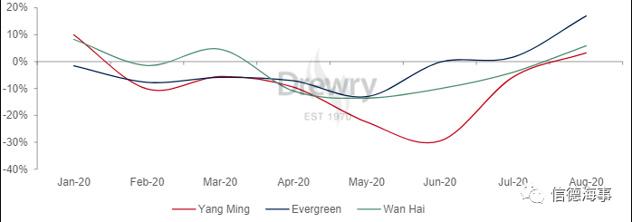 7月和8月的月度销售前景看好,因此预计2020年第3季度业绩会比较强劲;另一个证据是,三家台湾的航运公司的月收入增长,它们8月份收入的同比增长都呈上升趋势,其中Evergreen增长了17%。