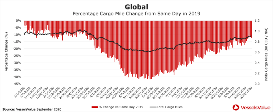 图6. 2020年1月以来的全球每日货量海里需求(十亿CEU-海里)需求从6月开始稳步回升,但直至9月仍然较去年同期低16%。
