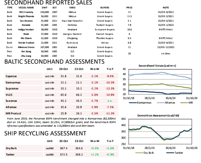 北海建造的4艘18万载重吨Capesize型船(2010年建造的TIGER JIANGSU,2011年建造的TIGER LIAONING,TIGER SHANDONG和TIGER GUANGDONG)以6400万美元的价格打包卖给了希腊买家。同样在大连建造的180,000 载重吨的AQUA VISION,以1575万美元的价格卖给了一位希腊买家。相比之下,日本177000吨的KING ORE(2010年在Namura建造,装有洗涤器)以1950万美元的价格卖给了英国买家。Panamax/Kamsarmax市场上,82,000 载重吨的GEMINI OCEAN(2017年在JMU建造)以大约2000万美元交易。75,700吨级的巴拿马型DEWI PARWATI(2011年,在广州黄埔建造)以940万美元的价格卖给了中国人。Handysize市场是二手船市场里最活跃的部分:35000载重吨的NEW EVEREST(装有BWTS,2009年在Shikoku建造)以950万美元左右的价格卖出。相比之下,35000吨级的RAINBOW QUEST(2011年在山海关建造)被以700万美元的价格出售。2013年在Imabari建造的28,000 dwt“灿烂阳光”以720万美元的价格卖给了希腊人。28000 载重吨的PANVISION(2011年在Shimamani建造)以650万美元的价格卖给了希腊人/塞浦路斯人,而28000 载重吨的FAIR WINDS(2009年在 Imabari建造)以650万美元的价格卖出,买方没有披露。在油轮市场,307,000 载重吨的VLCC OLYMPIC LOYALTY II(2005年三星制造)以3250万美元的价格售出。在成品油轮方面,传言Marflet将以2300万美元的价格购买了STX公司50,000吨级的GLAFKOS(2013年建造),以及STX公司的51,000吨级的ATLANTIC MIRAGE(2009年建造)
