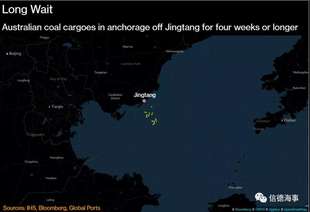 京唐港是中国进口用于钢铁生产的冶金煤的主要港口。滞留的21艘船所装载的货物中9批货物来自澳大利亚 Hay Point港,8批来自澳大利亚昆士兰州东南部的Gladstone港,4批来自Dalrymple港。