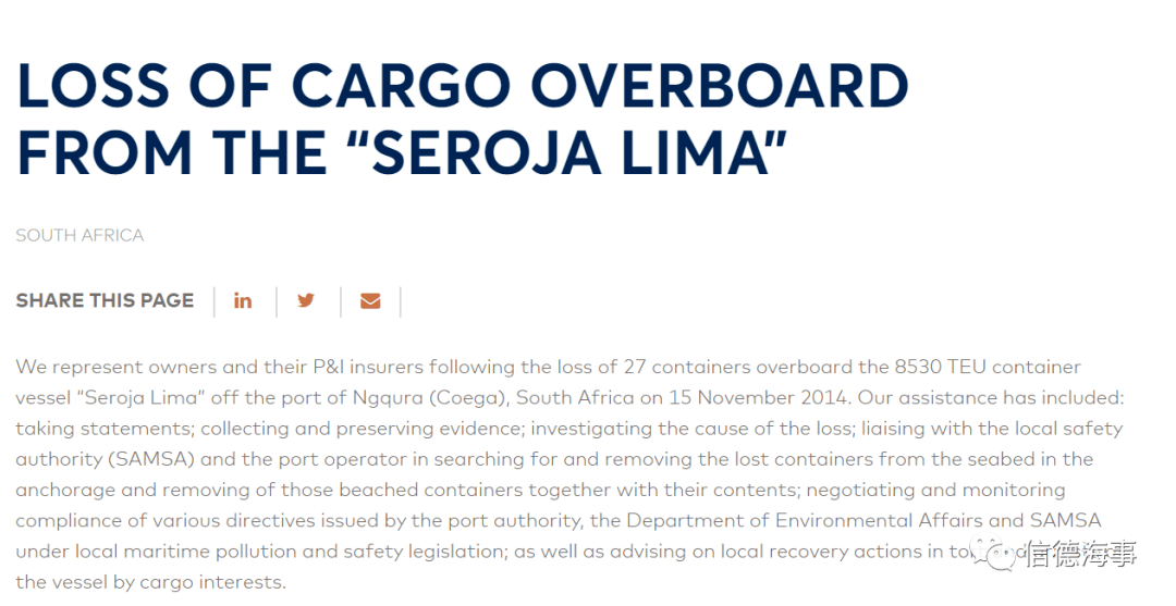 值得一提的是,根据律师事务所bowmanslaw方面提供的记录信息显示,这艘名为“SEROJA LIMA”的大型集装箱船舶于2014年11月15日也曾在南非附近海域出现过丢箱事故,当时丢失的集装箱数量也为27个。