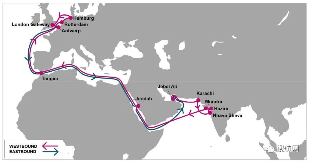 此外,除了船公司赫伯罗特以外,这些公司将在IOS 2中进行合作,IOS 2将进行以下港口挂靠:Jebel Ali –阿布扎比–卡西姆港– Nhava Sheva – 蒙德拉 –吉达–Tangier –南安普敦–不来梅港–鹿特丹–安特卫普–勒阿弗尔–阿尔赫西拉斯–吉达– Jebel Ali。