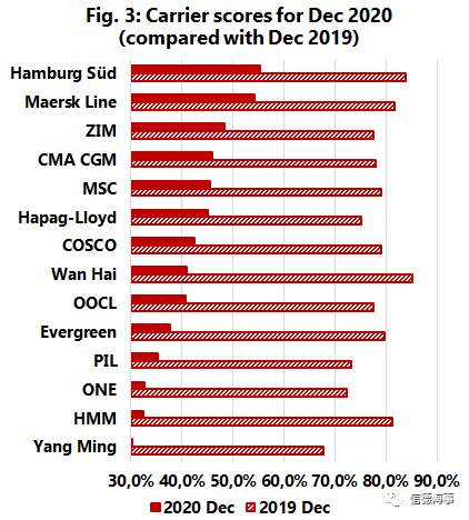 Sea Intelligence提供的数据显示,2020年的最后一个月,全球集装箱船舶的准班率再次下跌,又一次刷新底线,创下历史最低的 44.6%。