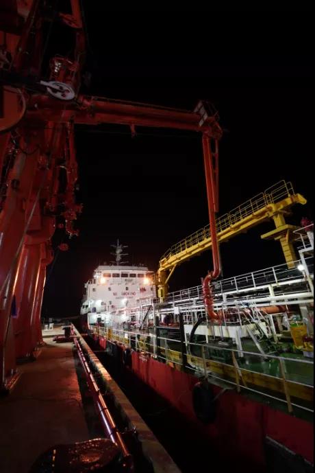 2月24日清晨,“苏伊士汉斯”抵达汉港锚地。在碧波荡漾的大海上,“库曼娜”通过一条长长的输油臂连接到“苏伊士汉斯”号油轮,并将1500吨燃料油缓缓注入。这是继2020年4月7日,中石化首艘燃料油船——满载2.5万吨低硫燃料油的马绍尔群岛籍“凯歌”号,完成燃料油卸载作业以来,汉港迎来的首单船舶加油作业。