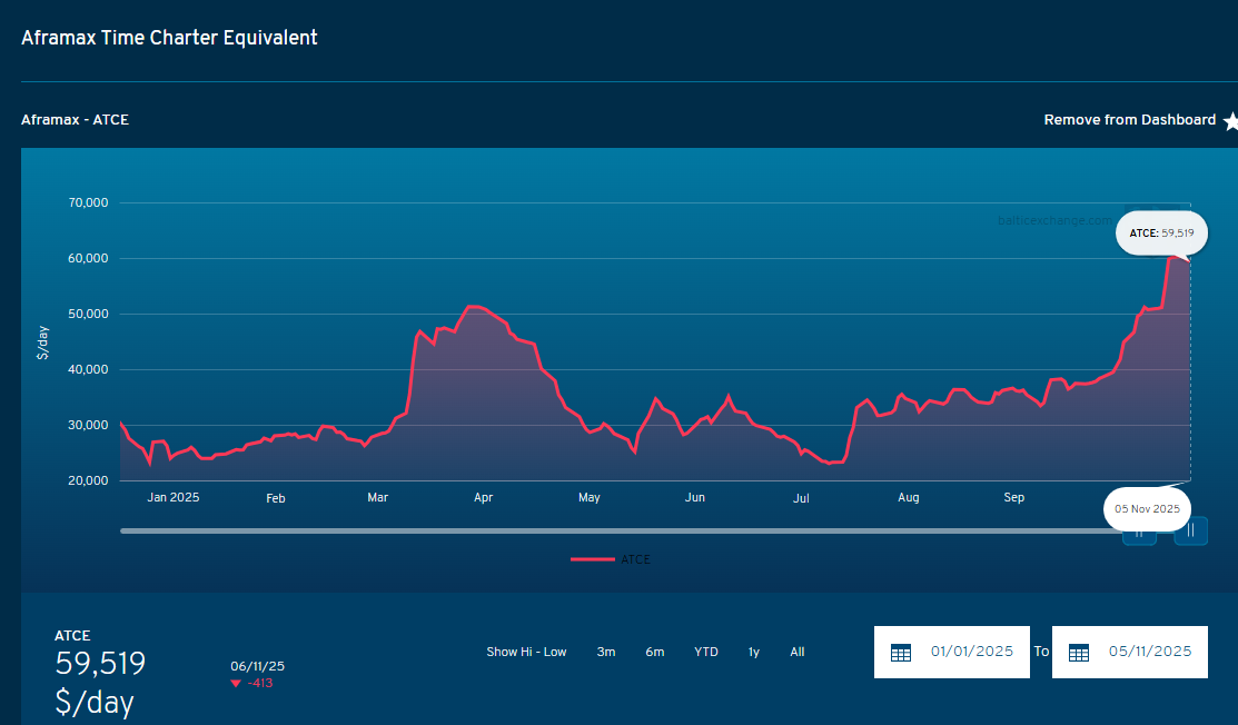 根据Jefferies数据,近期Aframax船型日租金达到约 65,500美元/天,较同时期LR2在清洁品市场的水平高出近 70%。