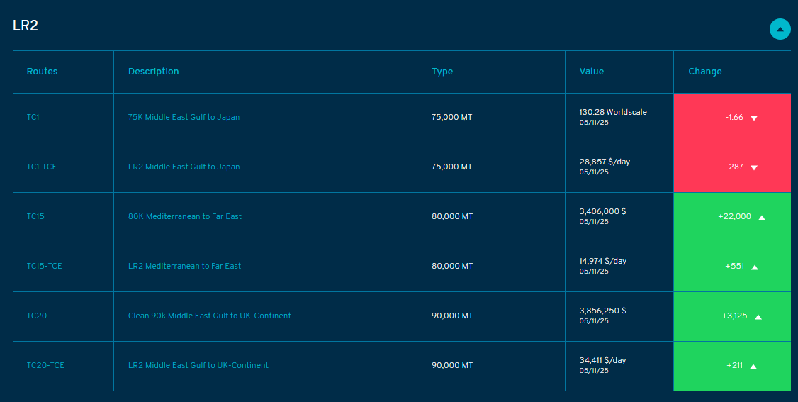 Clarksons最新估计亦显示,尽管LR2近期日租回升至3.5万美元附近,但仍明显落后于同吨位原油航线水平。