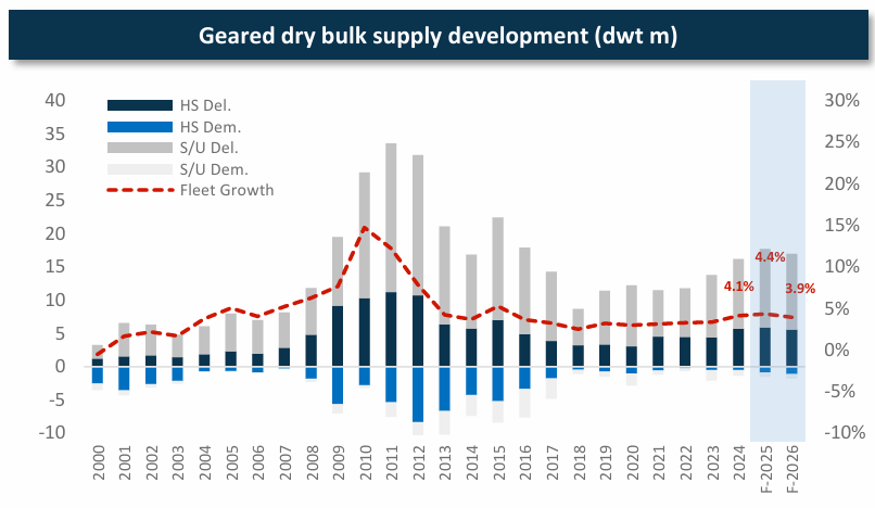从供给端看,其引用Clarksons数据展示了带吊干散货(geared dry bulk,包括灵便型及超灵便/大灵便段)历年“交付-拆解”带来的净供给变化,并预计该细分船队净增速在2025年约4.4%、2026年约3.9%,整体仍处于历史平均附近的合理增速区间。