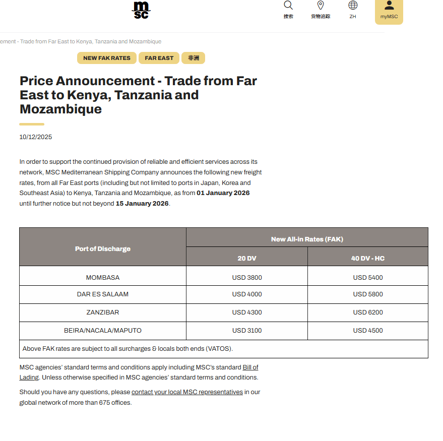 如近期MSC大幅上调价格,是一个很直观的例子。12月13日,MSC在北欧、地中海、黑海、北非以及东非多条航线再次上调FAK,相较此前计划进一步抬价,20尺柜最高再上调725美元、40尺柜最高再上调1250美元,部分目的地报价被推至高位。