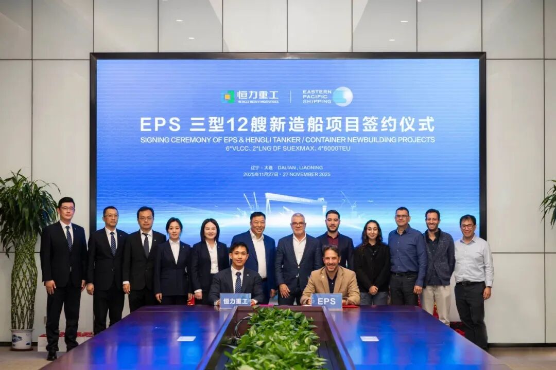 11 月 27 日,以色列船王 Idan Ofer 亲自现身大连恒力重工,与其掌舵的 Eastern Pacific Shipping(EPS) 一起,正式签署并生效了“三型 12 艘”的新造船合同。这批订单包括 6 艘 30.6 万载重吨 VLCC、2 艘 15.7 万载重吨 LNG 双燃料苏伊士型油轮、以及 4 艘 6000TEU 集装箱船,总金额约 11–16 亿美元,交付期集中在 2027 年下半年至 2028 年。