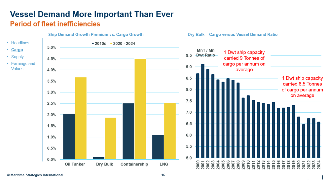 这一部分是 Adam Kent 认为最容易被行业忽视的变量。他指出,现代航运的效率正在系统性下滑——不仅来自地缘冲突导致的绕行南非,还包括天气、港口拥堵、速度管理、劳动力效率下降等多重因素叠加。这种下降使得“每1吨运力对应的有效运输量”大幅削弱,从21世纪初的每1 DWT 年均运输9吨下降到如今的约6.5吨。