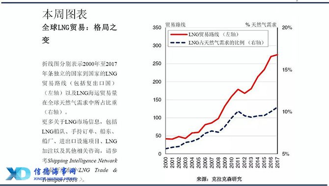 这二十年间LNG海运贸易如此惊人的增长趋势和多元化的发展格局在一定程度上是因为LNG贸易增长契合了全球能源结构逐步向清洁能源转变的这一趋势,2017年全球能源需求中约有1/3为天然气。而推动这一趋势的主要力量来自于发达及发展中国家中的相关经济和环境因素(详见第1314期航运信息周刊市场分析)。例如,2017年受到“煤改气”等环保政策的影响,中国LNG进口量总计达3,900万吨,同比增速超过40%。