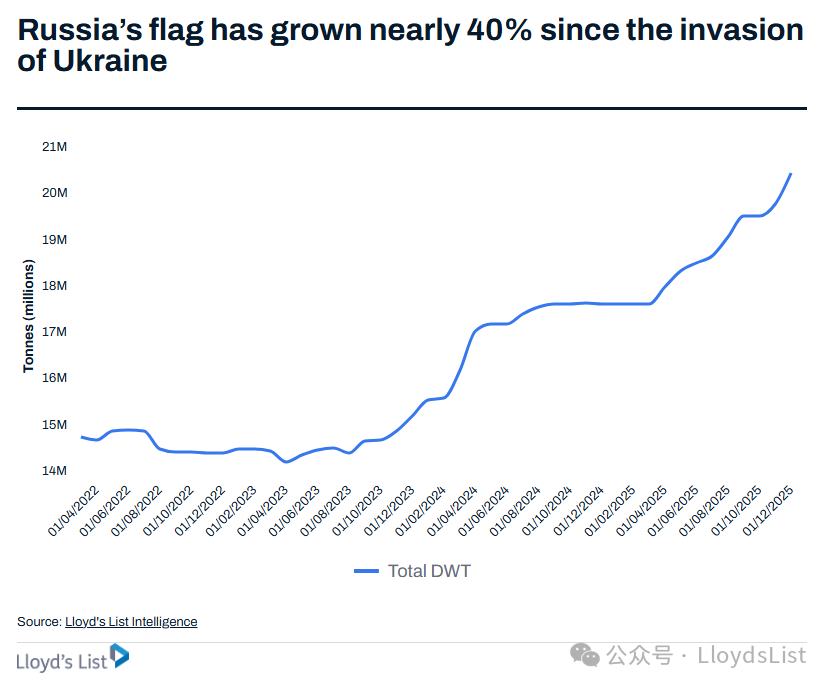 这种向俄罗斯转旗的变化趋势在上个月由《劳氏日报》率先报道,显示影子船队正在出现更为长期、制度化的演变——并将处于俄罗斯的直接监管与保护之下。
