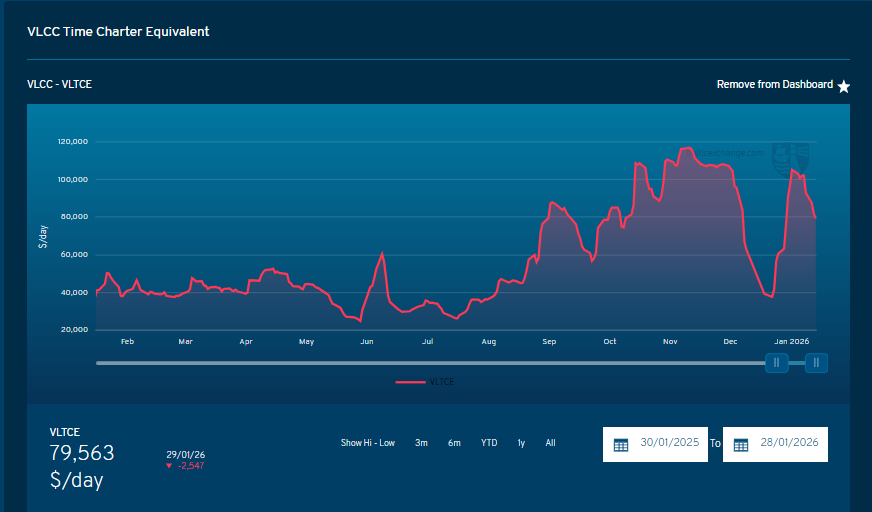 把镜头拉回市场层面,VLCC新单激增并非偶然:一方面,VLCC市场景气度明显回升,过去一年日租金出现大幅上涨,局部时段甚至出现六位数日租表现,强化了船东对中短期盈利弹性的预期;