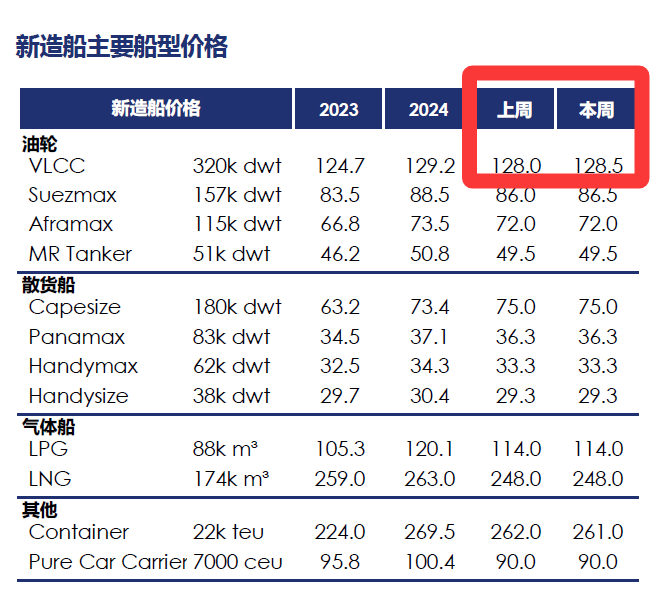 另一方面,二手船市场的适航船舶资源日趋稀缺,价格被持续推高——市场机构数据显示,5年船龄VLCC价格也已经超过了1.2亿美元,与1.28亿美元的新造参考价差距缩小到个位数百分比。