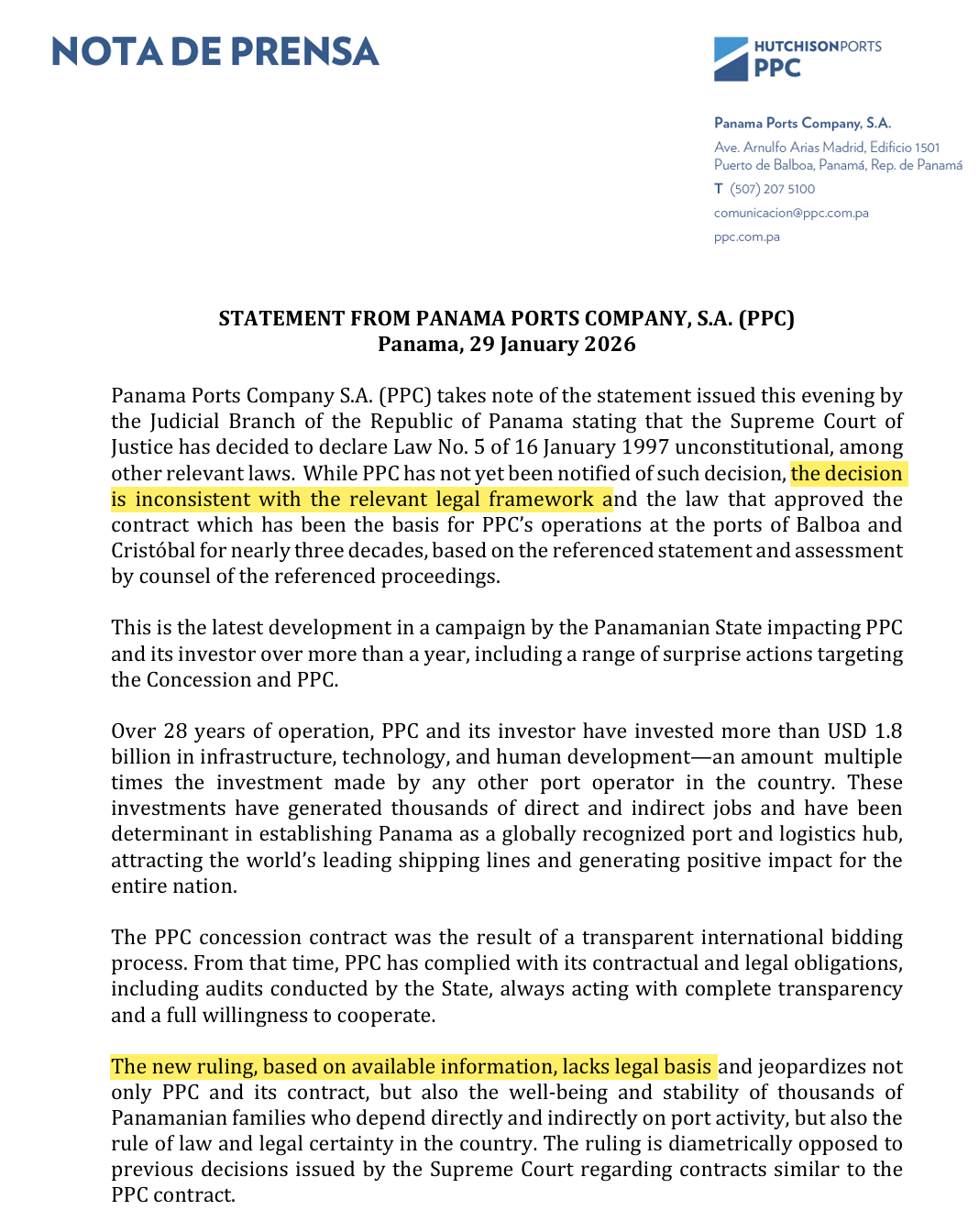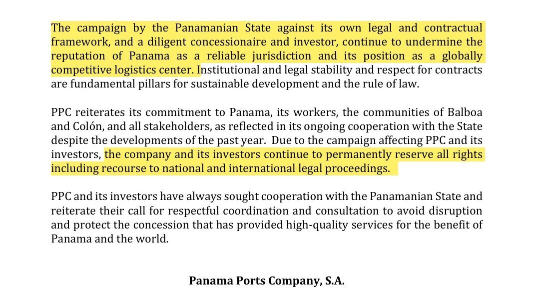 该公司强调,巴拿马国家层面对自身法律和合同框架、以及一家尽职尽责的特许经营方和投资者持续发起的行动,正在不断削弱巴拿马作为一个可靠司法辖区的国际声誉,也损害其作为全球竞争性物流中心的地位。