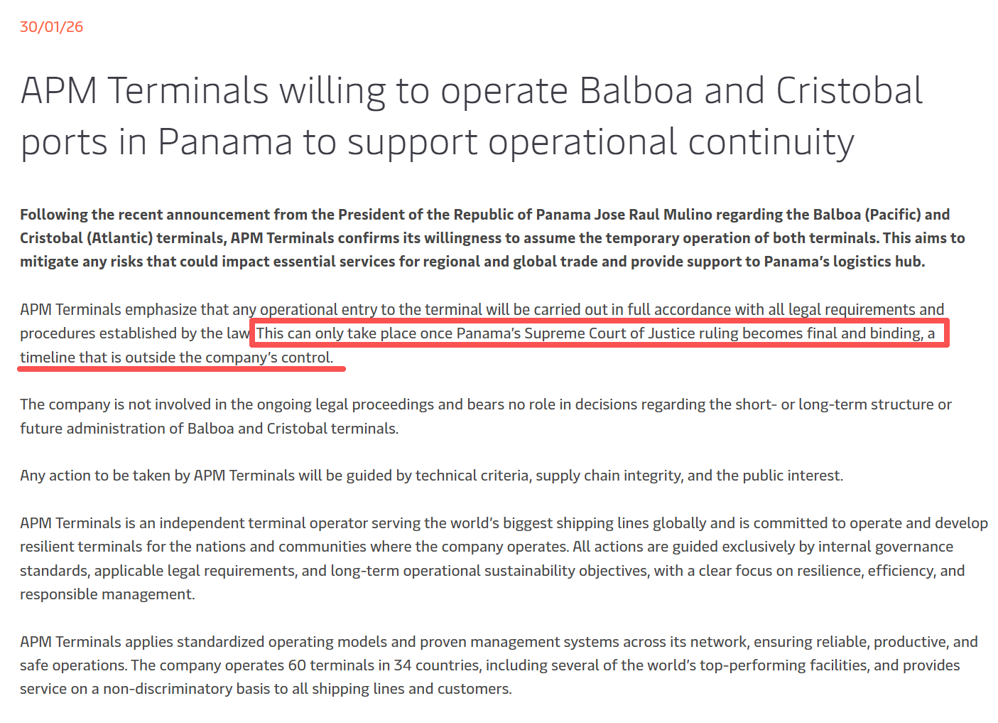 随后,马士基发表了确认公告。该司保持了高度技术化与审慎的表述。其核心立场是:愿意在过渡期内临时承担港口运营职责,目的在于保障港口作业和供应链的连续性;但任何实际接管,都必须建立在裁决最终生效并完成法定程序的前提之上。马士基同时强调,其不参与相关法律争议,也不决定港口未来的长期管理结构。