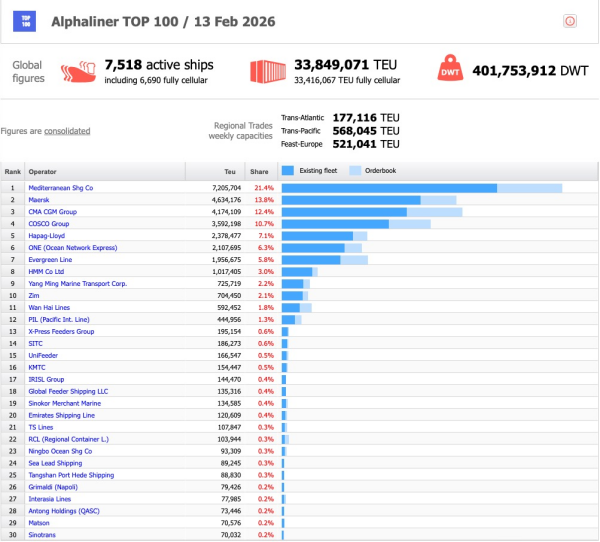 具体来看,在最新的全球班轮公司运力百强榜单中,MSC稳居全球第一,当前共运营船舶980艘,其中自有船舶727艘、租入船舶253艘,总运营舱位达到720.6万TEU。与此同时,MSC仍在持续加码长期运力储备,目前手持新造集装箱船订单共计127艘,总舱位规模达218.4万TEU,订单运力占其现有运营运力的30.3%,为后续全球市场布局预留了充足空间。