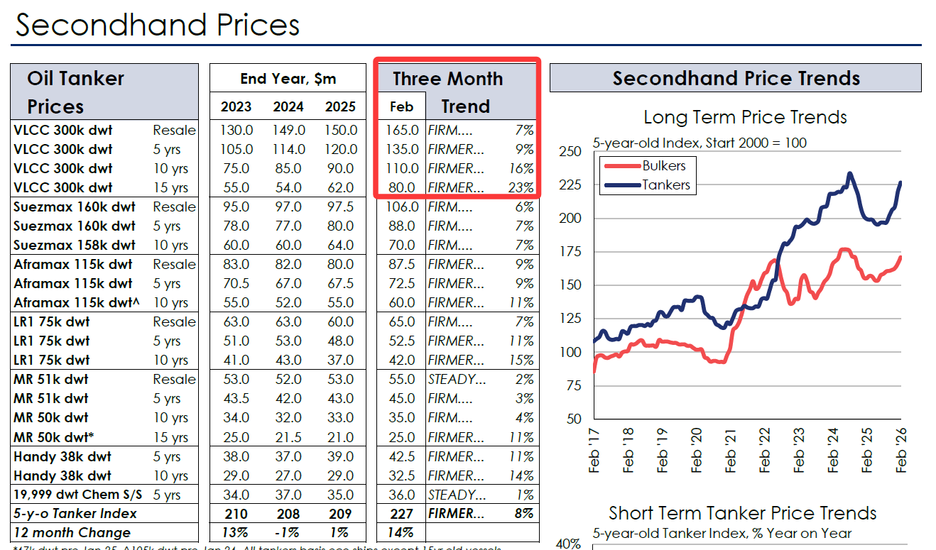 当即期端突破20万美元/天,期租端又在10万美元/天以上不断抬高“定价锚”,二手船资产估值随之上移便不再意外(详情见下图和信德海事网此前报道,暂不赘述:→船价大涨!运价大涨!交易量大涨!)。对市场而言,这是一套完整的自洽链条:运价高—现金流强—估值上调—买盘更敢出价,最终形成典型的正反馈。