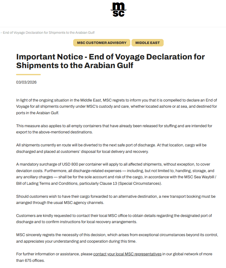 全球最大班 轮公司 MSC已于3月1日、3月3日、3月5日分别宣布:
