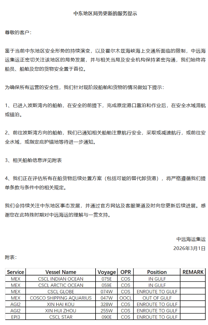 首先,中远海运集运分别于3月1日、3月4日发布服务提示表示,由于霍尔木兹海峡海上交通受到相应限制,公司决定暂停全球往返多个海湾国家的新订舱业务。涉及范围包括:卡塔尔、巴林、伊拉克、科威特,以及阿联酋(富查伊拉、豪尔费坎除外)和沙特阿拉伯(吉达除外)。
